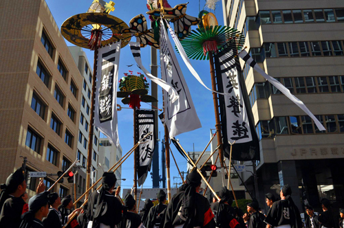 (むつみ橋交差点での旗頭演舞)