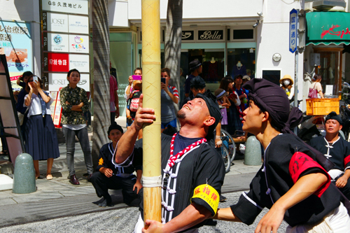 力と技術でこの旗頭を舞わせて、国際通りを練り歩きます。